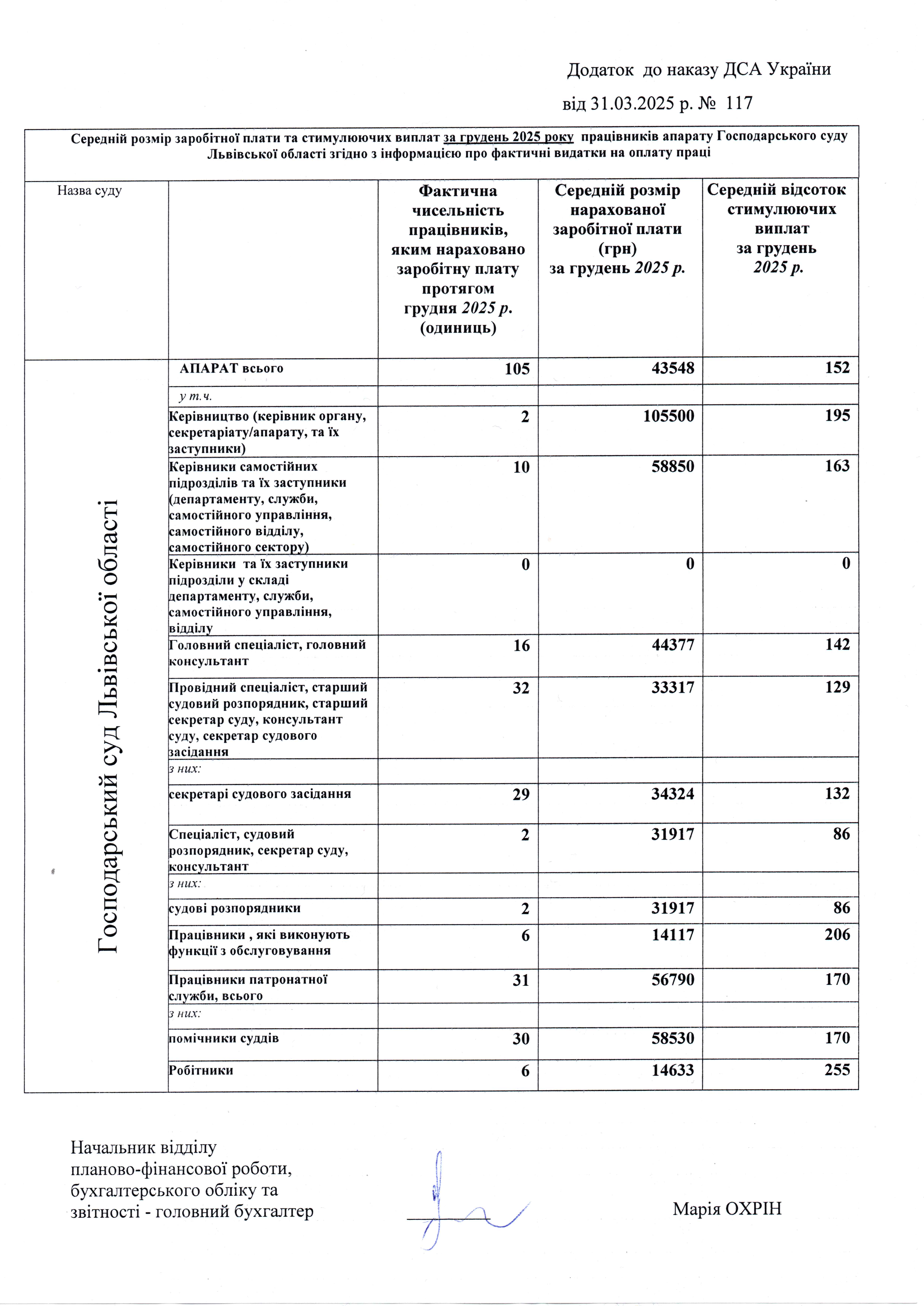 Інформація про середній розмір заробітної плати та стимулюючих виплат працівників апарату суду за грудень 2025 року
