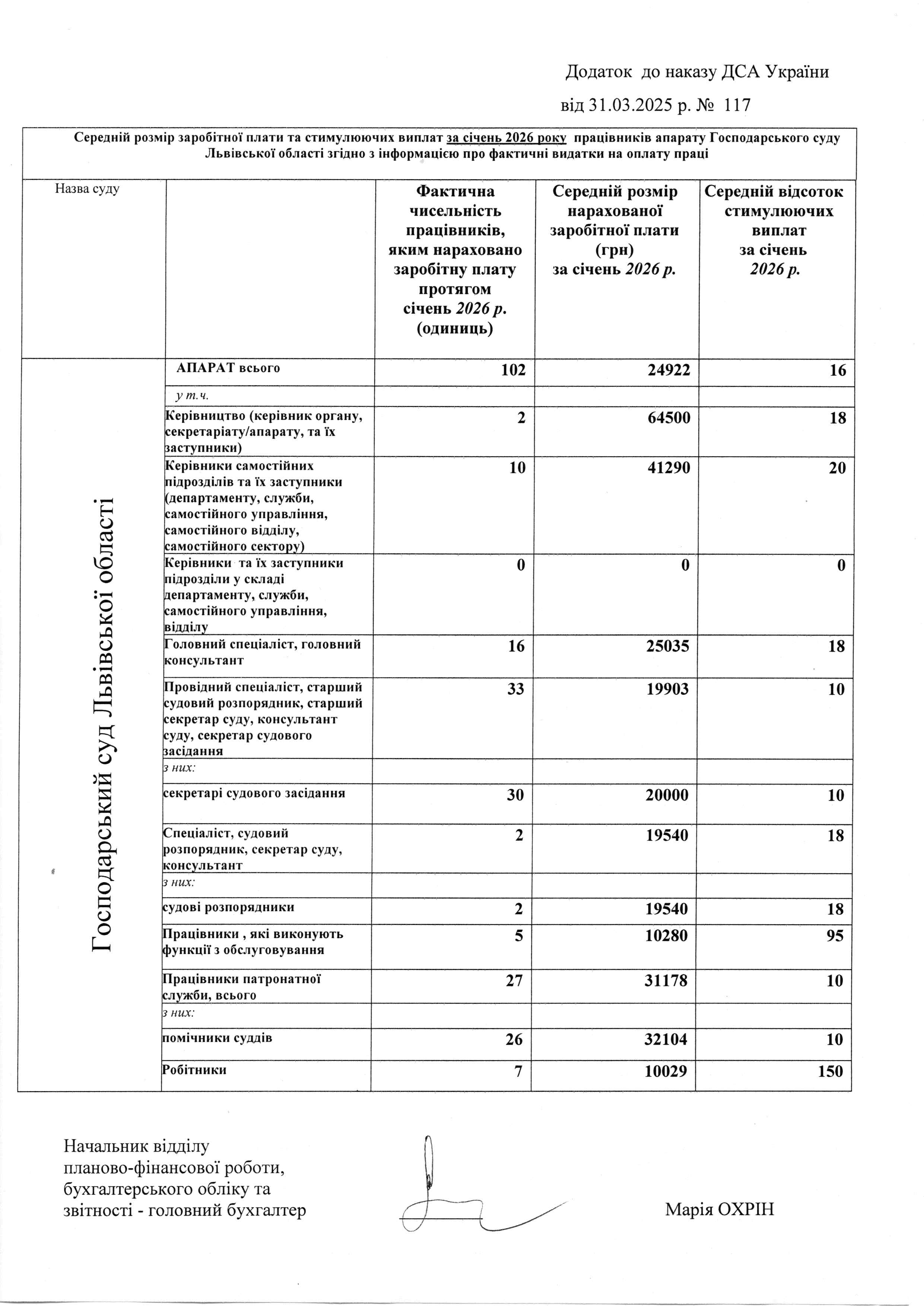 Інформація про середній розмір заробітної плати та стимулюючих виплат працівників апарату суду за січень 2026 року
