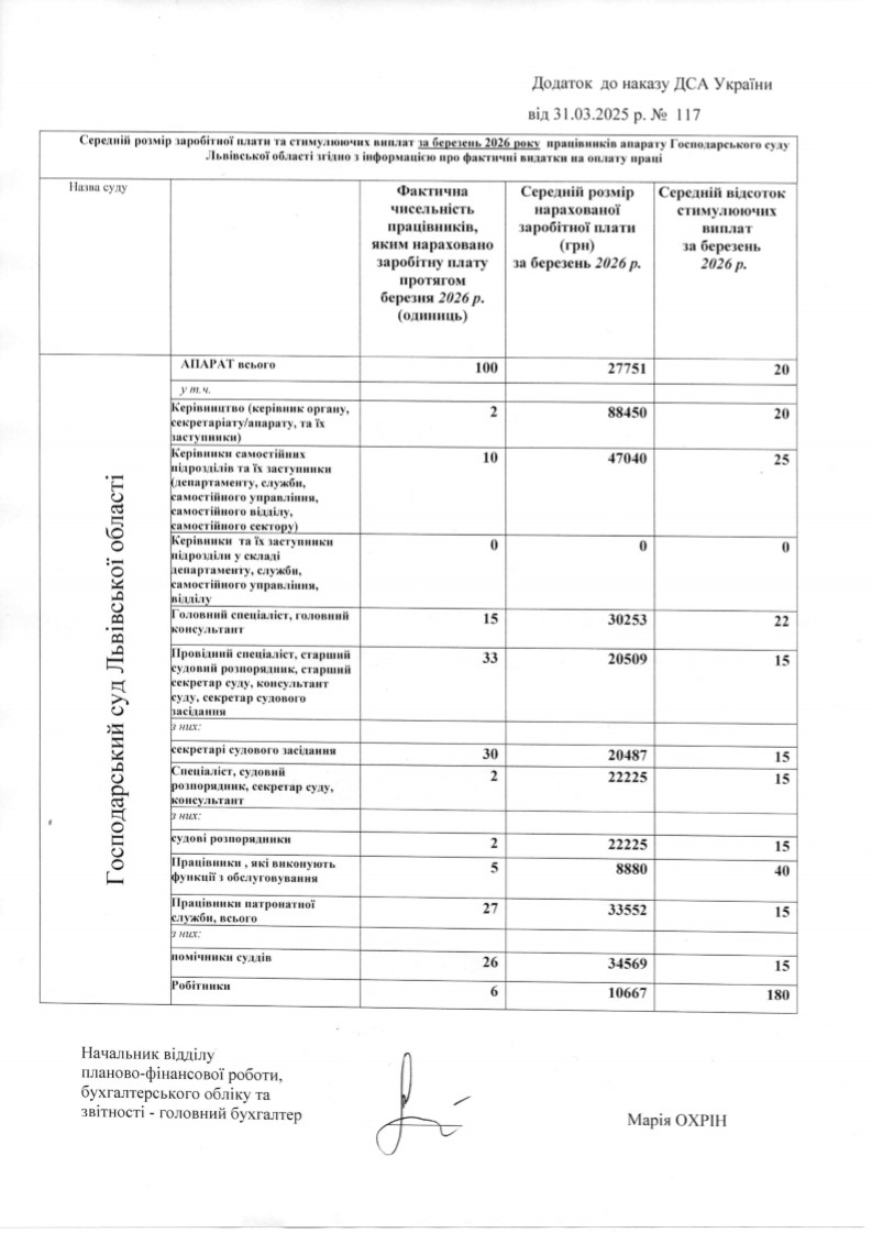 Інформація про середній розмір заробітної плати та стимулюючих виплат працівників апарату суду за березень 2026 року